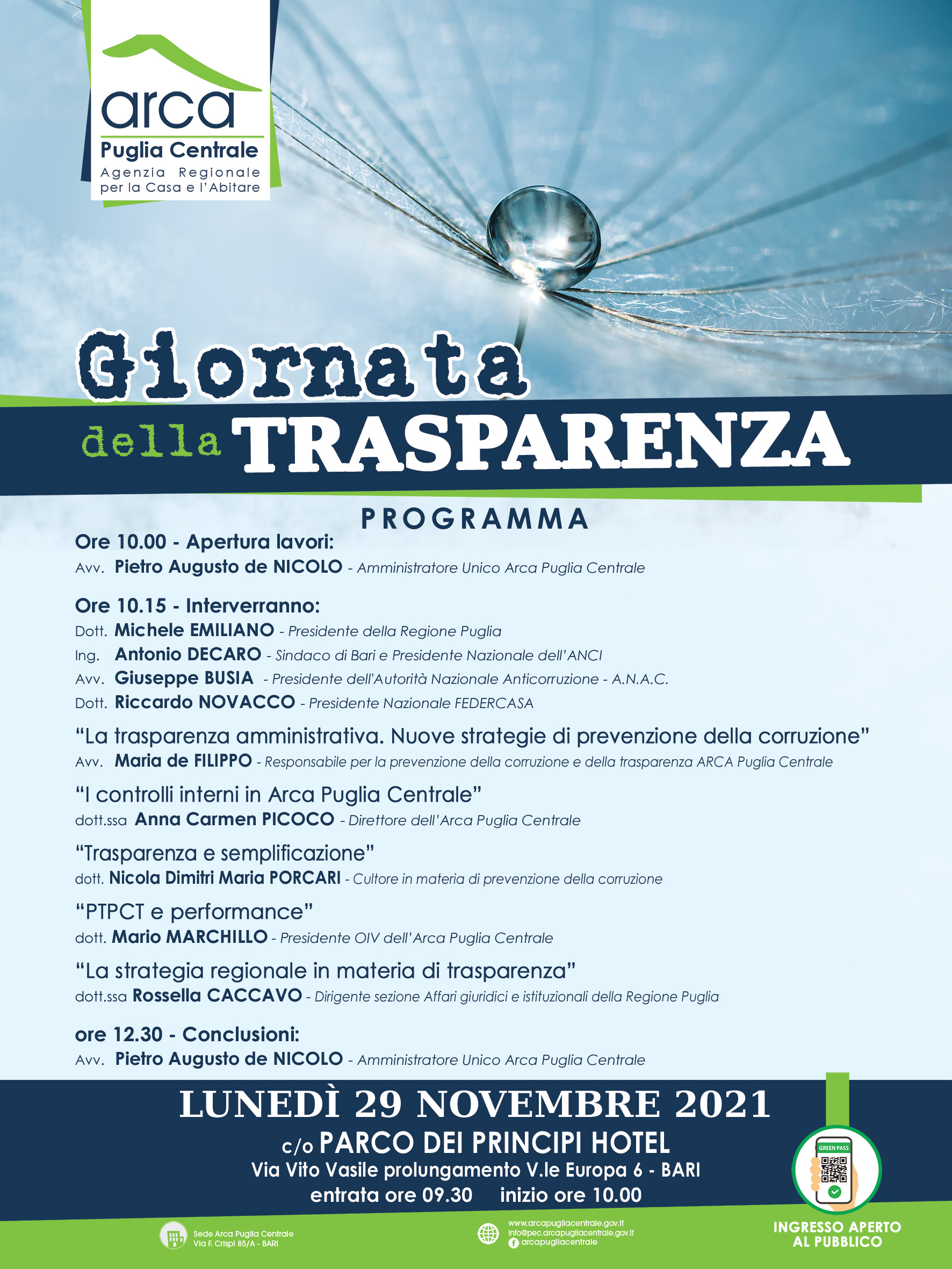 Si terrà il prossimo 29 novembre, presso l’Hotel Parco dei Principi a Bari ed in diretta streaming a partire dalle ore 10.00 alle ore 13.00 la Giornata della Trasparenza 2021, organizzata dall’Agenzia Regionale per la Casa e l’Abitare Puglia Centrale.